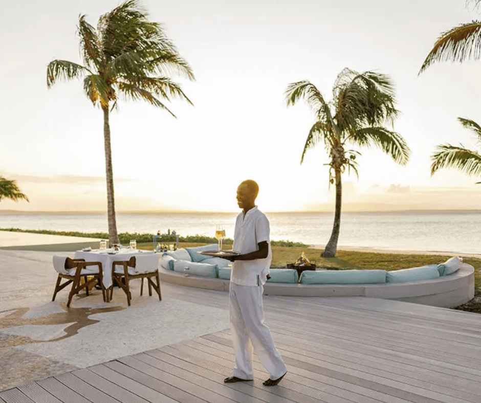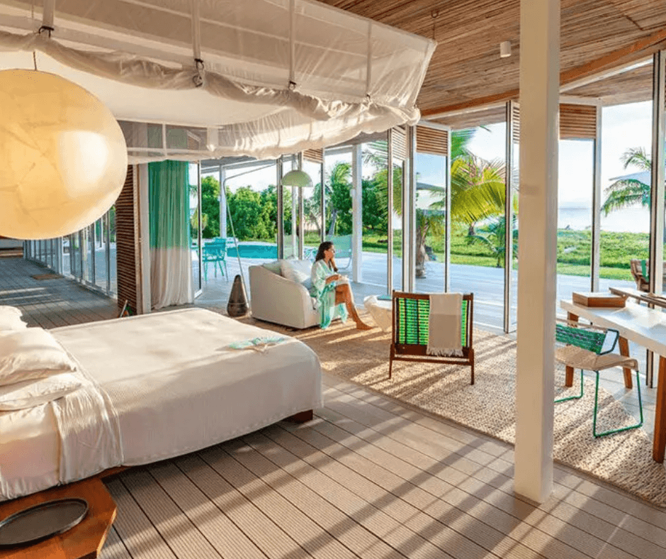 Your journey begins with a helicopter flight over the reef-protected waters. From the air, the ocean is a kaleidoscope of blues—from deep navy to pale neon turquoise. You land in a place where your biggest decision of the day is whether to take your private electric buggy to a secret cove for a picnic or stay put in your villa and listen to the waves.